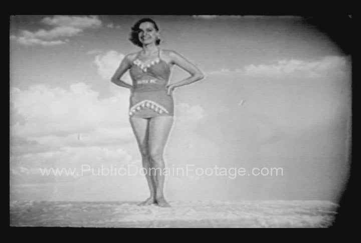 15 seconds of happy 1950’s children at the beach with mom showing off their new swimsuits.